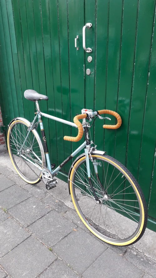 Deze bloedsnelle stadsfiets is volledig nieuw opgebouwd. Het frame is een Batavus Champion uit de jaren ’80 en is gecoat in de kleur mint turquoise. De wielen zijn door mij gespaakt met lichtgewicht (double butted) spaken. De prachtige pedalen zijn gemaakt in de jaren '70 door Lyotard. Het zadel is een Brooks B17S (aged).
