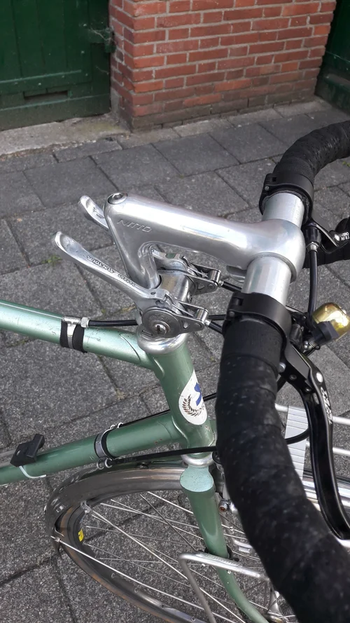 Deze chique lichtgewicht tourfiets is opgebouwd met een handgebouwd stalen frame van een onbekende bouwer. Het Velo Orange Montmartre stuur met de lange stuurpen zorgen voor een comfortabele rechte zithouding. De prachtige klassieke remhoeven zijn van Shimano Dura Ace.