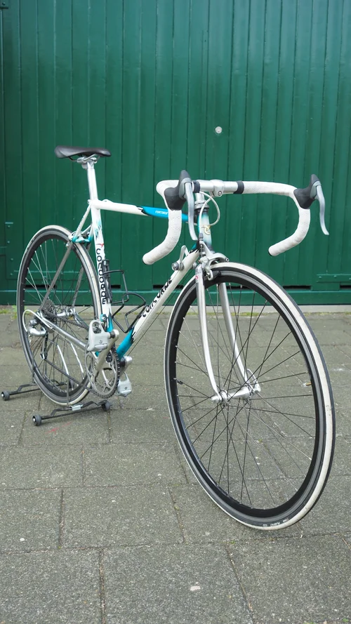 Na heel wat uren schuren en polijsten is dit het resultaat. De fiets is afgemonteerd met een mix van Campagnolo onderdelen. De prachtige klassieke pedalen zijn van Lyotard.